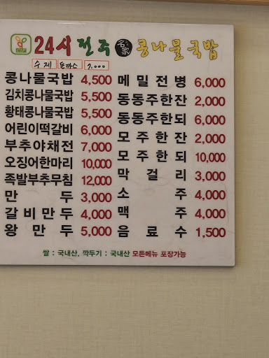 Read more콩나물국밥 4500원. 다진 청양고추, 새우젓, 오징어젓을 곁들여 주고 날계란과 깍두기 단지는 테이블에 있다. 전주식은 원래 수란에 김과 깻잎무침을 주는 걸로 알았는데 이 집은 보다 저렴한 버전으로 맛은 깔끔하다. 국밥에 밥이 적다 싶었는데 공기밥은 셀프 무료. 그렇지만 테이블에 앉으면 평상으로 올라가 공기밥을 퍼 오는게 조금 민망할 수 있겠다. 24시간 음식점인데 전체적으로 깔끔하게...