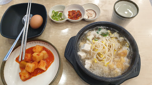 "Cook bab" it's a kind of korean traditional fast food, hot plain soup and rice with 'bean sprout'.