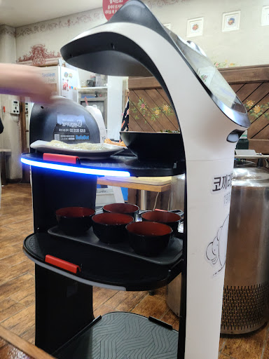 Ordered 만두 (dumplings - steamed and fried), 야채 김밥 (vegetable gimbap) and 비빔밥 (bibimbap). Food was good and came relatively fast - however the size of the dumplings have gotten smaller since not too long ago. The automated servers were a cute gimmick and made it worth visiting to experience in person at least once. Price for the food was OK - again, the atmosphere and the quality of the food make it worth visiting this place...