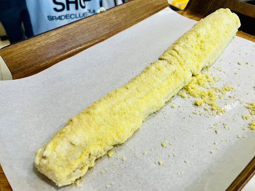 이것이 바로 디저트! 어디선가 먹어본 듯한 맛인데, 또 처음 먹어보는 빵! 모양은 마치 가래떡에 콩가루를 뿌려놓은 것 같지만, 먹기 좋은 롤케이크 스타일이다. 겉에는 카스테라 가루가 뿌려져 있고, 속에는 부드러운 크림 같은 것이 들어 있어 한입 베어 물면 부드럽다. 부드럽고 또 부드러운데… 달달달하다. 만약 부드럽기만 했다면 식감이 밋밋했겠지만, 끝에 살짝 쫀득함이 느껴져 식감이 아주 좋다. 흡사 부드러운 찹살떡을 먹는 느낌이랄까? 왜 이 빵이 시그니처 메뉴인지 알 것 같다. 길쭉한 형태지만 먹기 좋게 잘라줘서 먹기 좋다. 생각보다 가성비, 아니 가심비가 아주 좋은 빵이다.