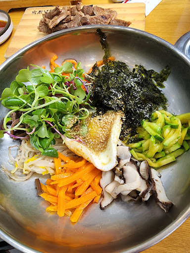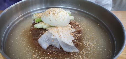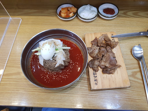 Read more역시 여름엔 냉면 메뉴엔 고기가 항상세트로 비빔밥도 고기가 세트 저렴하고 맛나요~냉면고기세트 7500원 냉면양은 많지않음 고기가있으므로 양이 부족하지 않았음 고기싫으면 냉면양을 곱배기로 주문가능(곱배기양도 그리많지않은느낌) 그래서 1인 1메뉴 해야됨 사이드 반찬셀프 친절함...