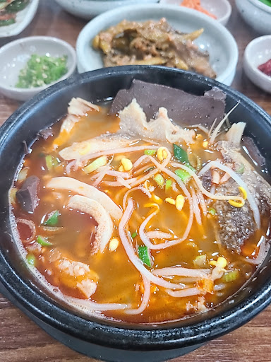 이 곳에서 해장국을 간단하게 먹고 왔습니다. 주차도 간편하고 음식도 입에 괜찮았습니다. 가격도 저렴한 편이고요. 해장국은 등뼈가 아닌 소양 해장국입니다. 밑반찬은 김치, 깍두기, 무말랭이 조림에 양파와 땡초로 간소한 편이며, 깍두기가 입맛에 맞아서 좋았습니다. 소양 해장국은 소양이 적고, 콩나물이 가득해서 좀 아쉬웠지만 저렴한 가격 생각한다면 이 정도가 딱이겠지요. 외진곳에 있었지만 의외로 찾는 분들이 많은 가게입니다. 외진 곳임에도 불구하고...