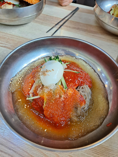 여기 돈까스밀면이 진짜 죽여줍니다. 사람들 들어오면 왜 그냥 밀면만 시킬까요? 4000원 추가하면 바삭바삭 돈까스를 바로 튀겨서 얹어주시는데..... 제가 냉면 정말 좋아해서 여름 시작하면 주식을 냉면으로만 먹는 사람인데 여기도 강추합니다^^ 맛은 좀 삼삼해요. 약간 짭짤하고 시원하고 그리고 온육수도 먹을 수 있는데 강추입니다. 만두는 제가 안 먹어봐서 모르겠네요 가서 시켜먹어 보세요. 주문 하면 바로 만들어 주셔서 맛있을 듯 합니다?? 추측이지만...^^ 4000원 더 추가하면 돈까스 하나 더 주신대요. 먹으러 가세요!! 울산에 냉면 맛집 정말 많아서 행복합니다. The pork cutlet noodles here are really amazing. Why do I just order push noodles when people come in? If you add 4,000 won, the crispy pork cutlet will be fried and put on top right away. I really like cold noodles, so when the summer starts, I only eat cold noodles, but I strongly recommend it here, too. It tastes a little sour. It's a little salty, cool, and you can eat hot broth, but I strongly recommend it. I don't know because I haven't tried dumplings. Go and order them. If you order, you can make it right away, so it will be delicious?? It's a guess...^^ If you add 4,000 won more, they will give you another pork cutlet. Go to eat!! I'm happy that there are so many naengmyeon...
