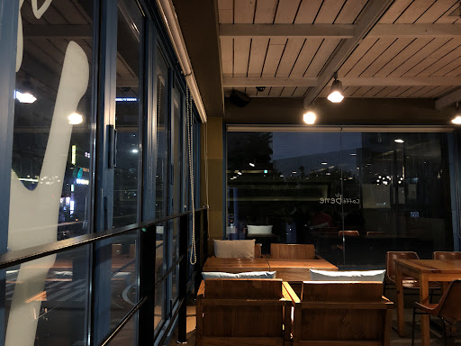 This cafe has two floors. It is open late and has decent bagels. It also has a...