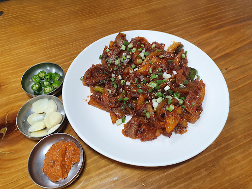 돼지껍데기도 메뉴에 있길래 주문했습니다. 무려 '특미'라는 글자가 붙어 있길래! 빨간 양념에 마늘향과 후추향이 나고 간도 적절하고, 양파와 파까지 더해져 좋았습니다. 껍데기도 잘 조리되어 부드럽고 쫀득한 식감이었습니다. 왜 별미인지 알겠습니다. 개인 기호에 따라 매운맛이나 양념이 좀 더...