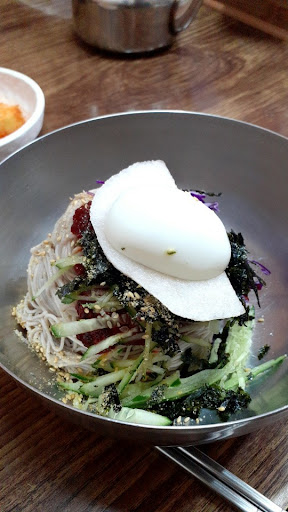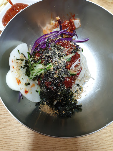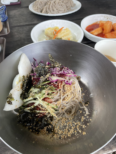 Read moreEtwas versteckt aber mit Google Maps zu finden ist hier ein „Gartenlokal“. Mit Tischen neben dem Parkplatz, recht ruhig. Wir waren morgens zum koreanischen Frühstück hier und haben ( sommerliche Temperaturen) Magukssu bestellt. Eine Kangwondo Spezialität. Buchweizen Nudeln mit kalter oder heißer Suppe. Auf den Tischen zum nachwürzen je nach Geschmack Sesamöl, Paprika Paste, koreanischer flüssiger Senf Zucker und Sojasoße ( die letzten beiden Zutaten passen nicht für Maguckssu) Es hat sehr gut geschmeckt und für zehntausend Won hat man ein leckeres erfrischendes Frühstück in...