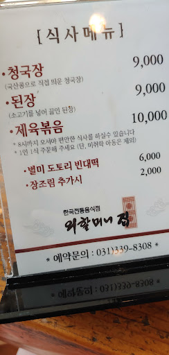 청국장이 생각보다 진하지는 않음. 반찬그릇이 놋그릇인데 밥그릇은 스테인리스..ㅎㅎ 적당한 식사한끼로 9천원은 좀 아까운듯. 청국장도 쿰쿰하지않고, 찌개에 들어가는 묵은지도 묵은지가 아닌 그냥 김치와 무같은 느낌. 특히 반찬으로 나오는 김치가 공장에서 갓나온 김치같은맛이라 손이 안간다. 남자들이 먹기에는 밥의양도 적게담겨있어서 아쉬움. 1인분에 9천원으로 이곳청국장을먹기는 아깝다는 생각이 든다. 제육볶음도 양이 아주 많이 적어서 아쉬움. 특히 반찬으로 장조림이나오는데 장조림은 더달라고하면 2천원.. 아마 근처에 주택가와 골프장이 없다면 이렇게 장사가 잘될까? 근처에 다른식당도 많으니 굳이 청국장아니면 안되겠다는 생각...