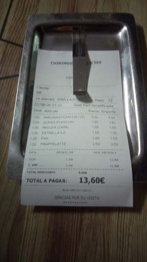 Read moreBastante bien. Entiendo que al ser un chiringuito no se vuelvan locos con ciertas cosas, pero creo que los vasos y copas debieran ser de cristal, sería un valor añadido. Los vasos vacíos de plástico se vuelan, un vaso de cristal no. Además el cristal es más cómodo para cogerlo y para beber, se disfruta más el trago y mantiene mucho más el frío que el plástico. Las marineras bien, correctas, sin lujos. Los calamares bien, ricos, algo pequeños, pero bien, algo caro para mí gusto. Yo haría muchos cambios, pero claro, como profesional, como público sé a dónde voy y lo que me voy a encontrar. Cubre las...