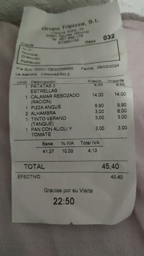 Read moreLa comida no estuvo mal, pero pedi una pizza de "angus" y la pizza estaba cruda y, ademas te la venden como carne de angus y era una de ternera normal y corriente. Ademas el servicio es pesimo, tardaron mucho en atendernos. Nos pedimos bebidas y nos dijeron que luego venian a tomarnos la nota de la comida (cuando podiamos decirselo al que nos tomo las bebidas), y tardaron como 30 minutos para tomarnos nota de queriamos comer, por lo que se nos acabaron las bebidas. Ademas estaban calientes, sobre todo una cerveza que pedi yo. Luego nos intentaron vender que si queriamos pan con ajo o unas aceitunas y les dijimos que no porque sabia que nos la iban a cobrar y sinceramente no me apetecian, aun asi nos las trajeron y nos las cobraron, poniendonos de excusa que nos las iban a cobrar igual que para eso nos traian el pan. Que por cierto nos cobraron 3€ por 3 cachos de pan, un poco estafa la verdad y la cerveza ya valia 3€ tambien. Si nos lo iban a cobrar que no me hubieran preguntado si queria o no. En resumen entre que la bebifa que estaba caliente, usan la tecnica de que te tome la comanda de la comida otro y luego tardan, lo de la "tapa" que nos la metieron por narices sin quererla y la comida estaba cruda, nefasto. Un trato mas que malo, y muy caro para la experiencia. No volvere nunca mas, no se lo recomendare a nadie. No le pongo 0 estrellas porque no puedo, pero me sento muy...