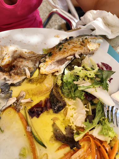Tardaron casi una hora y media en servirnos la comida. El pescado estaba bueno, pero ya con el retraso y el cambio inicial, empezábamos a estar incómodos. Además, venía acompañado de unas patatas fritas frías y recalentadas.