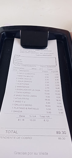 Read moreSeñor dueño, por tener más educación que usted, sé que es agosto y hay que comer en casa... pero cuando se recibe una comanda y no se cumple con la petición de los comensales (queriamos pescado fresco simplemente) que por cierto, nos hemos dejado asesorar por su personal (GALLO PEDRO FRESCO DE UNOS 700GS frito con ajos) se retira la comanda y no se cobra, aunque se haya comido medio, un cuarto o una porción. Debe tener la humildad de asumir el error y si considera que el error no es suyo, informe al cliente de que igualmente va a cobrar la parte que se ha desperdiciado 16€, según usted comido, retirándolo de la mesa diciendo que estaba perfecto y que SE LO LLEVARÍA A CASA PARA SEGUIR COMIÉNDOSELO. Espero que le siente bien. Por cierto, el atún frito que nos han ofrecido de alternativa al gallo, con todo el aceite del mundo, tampoco creemos que sea la especialidad de la casa, aunque sí que lo han cobrado porque evidentemente nos lo hemos comido. Con esas vistas, ahora sí entiendo porque...