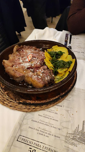 -Las judias, buenas de sabor pero quizás demasiado caldosas a mi gusto. -Las patatas revolconas no me transmitieron demasiado, sin estar mal. -el chuletón, con denominación de origen, no podía fallar. Absolutamente genial y gigantesco (imagino que 1 kg). Pedido al punto y traído al punto. Genial, repito. -el helado con yemas, muy rico y bien presentado por otro lado.