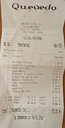 Read moreEl Restaurante Quevedo es un verdadero tesoro gastronómico que destaca por su ambiente acogedor y su atención al detalle. Desde el momento en que entras, te sientes envuelto en una atmósfera cálida y elegante. El servicio es excepcional; el personal es amable y bien informado, siempre listo para recomendar los mejores platos.