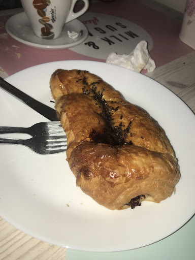 Local muy bonito y está en muy buena zona. La tostada gratinada de jamón estaba riquísima, buen pan, el tomate rallado muy rico, jamón y queso gratinado con buen sabor. Pedimos también un virolo, otro dulce más que no recuerdo también de hojaldre y mantequilla y la caracola de chocolate. Virolo y hojaldre muy ricos. La caracola de chocolate nos la trajeron caliente y creemos que no fue buena idea...