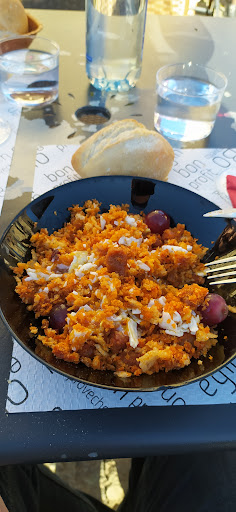 Read moreTodo un error comer en este lugar. No fue nuestra primera elección, pero había muchos sitios cerrados. Para empezar, se han flipado con el precio. No hay carta, sólo menú. A 26€ por persona, el cual sólo incluye una bebida. De locos. De primero mi pareja pidió risotto, el cual sólo era una argamasa de arroz con nata (el cocinero debería saber cómo se hace un risotto ya que no es con nata) que se podia cortar con cuchillo como se ve en la foto; y yo pedí unas migas, bastante insulsas y sin sus avíos. De segundo, ambos entrecot. Uno no estaba mal. El segundo... Más de la mitad era grasa y tendones, no se podía comer. Para ser educado, me levanté para decírselo dentro en lugar de en la terraza y aquello se convirtió en un capítulo de Pesadilla en la cocina. El dueño-cocinero es un maleducado, impertinente, soberbio, chulo y borde. En lugar de ver que el entrecot no se podía comer y cambiarme el plato, me dice que eso es así, que si tiene mucha grasa y tendones que me aguante. Le digo que, por favor, mire el plato, que no hay carne y que no se puede comer y su respuesta fue que "eso no se lo comen ni sus gatos". Literal. Sin sentido. Me dice que la carne que tengo en mi plato es la que hay y que me aguante pero que eso "no se lo comen ni sus gatos". Sus gatos no, pero sus clientes sí. Todo eso a voces y diciéndome que me vaya de allí. A la hora de la cuenta, me quiere cobrar los dos menús (52€), a lo que me negué y exigir pagar uno y medio. Mal servicio, mala comida y mala...