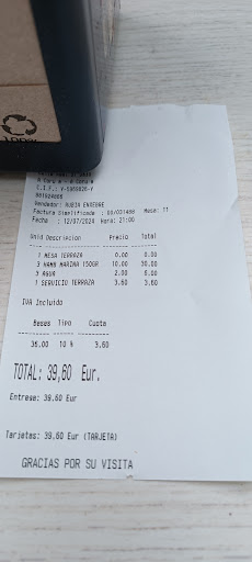 Read moreNo me parece normal que se cobre 3,60€ por uso de la terraza cuando tienes un local pequeño y semi acabado en el que hace un calor sofocante porque no tienes o no pones el aire. Entiendo que el servicio en terraza tenga un suplemento pero lo lógico es que si te lo cobran te atiendan allí (después de 10 min esperando fuimos a pedir a la barra donde un señor que estaba sentado con el móvil nos tomó nota del pedido)... En fin, no me parece muy lógico, debería estar indicado en la cartelería exterior. Al menos, la comida sí que tuvieron la deferencia de traérnosla a la mesa.
