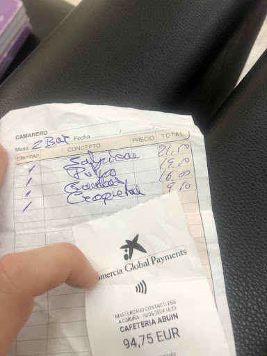 Si pudiera le daba 0. Una auténtica vergüenza, entras y es más una cafetería que restaurante. Nos sentaron en una mesa enana al lado de la barra cuando éramos 4 personas y no podíamos ni movernos. Viene el camararero te canta lo que tiene ( no había PRÁCTICAMENTE NADA de marisco) no te dan una carta por lo que no sabes los precios de lo que estás pidiendo. La comida normal, sin más, pero cuando vino la cuenta alucinamos. Una ración de salpicón casi 22 euros!! , una cazuelita de gambas al ajillo, tocamos a 4 literal por persona 16 euros … Cuando pedimos explicación al camarero pidiendo la carta de precios nos dice con mucha chulería que no hay y que ellos No trabajan así. Le mostramos un tiket que encontramos en google de ese mismo bar ese mismo de otra reseña de Google donde el precio era la mitad de lo que nos había cobrado, a lo que nos dice que eso no puede ser de ese año cuando se veía claramente la fecha en el tiket. En fin salimos indignados, sintiéndonos engañados por toda la cara solo por el echo de ser turistas, y eso que somos nacionales, ni pensar quiero lo que les meterán a los extranjeros. No vayáis hay mil sitios mejores más baratos con mejor calidad ambiente decoración del local Y...