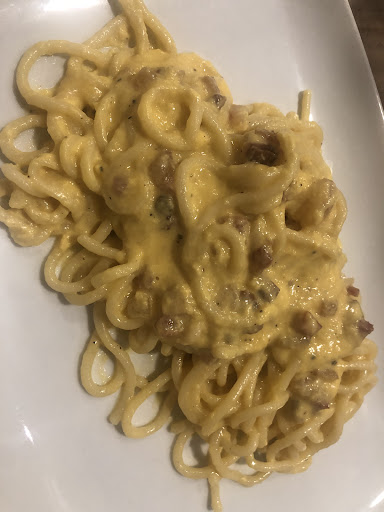 Lo que a mí me emocionó (uno es así) fue ver unos cartelitos colocados en la pared en los que se mostraban allí héroes cruzados de la batalla contra la nata, lo que me llevaba irremediablemente a pedir unos espaguetti a la carbonara, a ver si eran como mandan los cánones. Espectaculares. Tras haber ido a tanto restaurante italiano en el que acaba uno saturado de salsas con nata y digestiones pesadas resueltas a base de paladas de bicarbonato sódico, fue un gusto disfrutar tan buena comida italiana, con productos de calidad, factura casera en el buen sentido de la palabra, y con una sensación de haber comido bien. Yo desde luego, ahora que estoy en Galicia y alguna escapada haremos a Coruña, tengo ya marcado este restaurante como referencia.