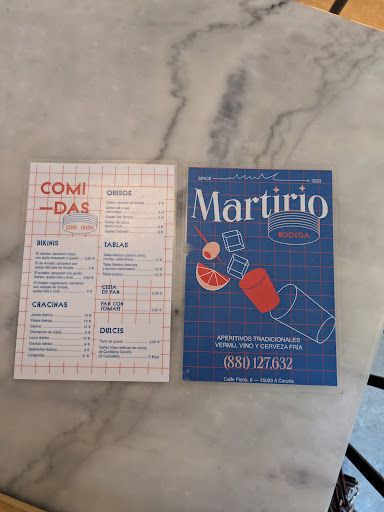 Read moreHe ido varias veces a la vermutería Martirio, me encantaría de decir que es un sitio estupendo porque tiene una localización inmejorable y una terraza muy amplia, pero la realidad es que siempre nos han atendido bastante regular. De todas las veces que he ido nunca nos han atendido con un tiempo prudencial de espera siempre hemos tenido que ir a pedir a la barra y preguntar por la consumición y en casi todas las ocasiones nos han vuelto a mandar para la terraza a esperar a que nos atendiera alguien, y es indistinto que haya o no haya gente, está claro que todavía les falta mucha organización a nivel personal. La comida es correcta, una tabla de embutidos, tortilla que se suele acabar pronto, ensaladilla o boquerones, pero tardan tanto en atender y se suelen olvidar tantas veces que pierdes las ganas y te acabas yendo a otro sitio. En alguna ocasión hemos escuchado algún comentario muy poco apropiado por parte de alguna camarera, solo hay que ser educado y no pasa muy a menudo. Si tienes todo el tiempo del mundo y no te importan tanto las formas en las que te atiendan es un sitio para tomar un vermut y un pincho, pero hay que armarse...