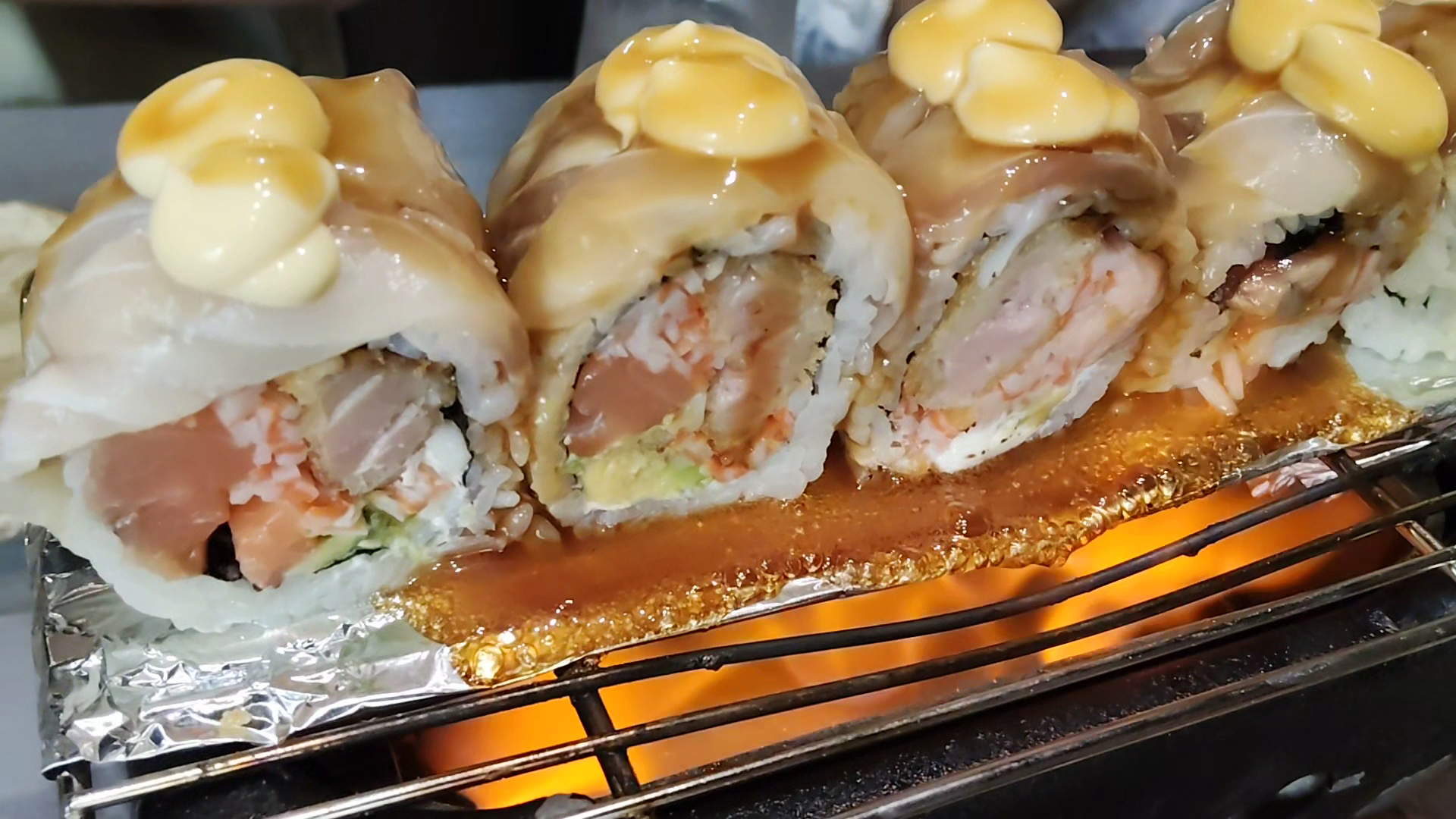 El punto crujiente de esos bocados de arroz juega de maravilla con la delicadeza del salmón: se suman con gracia sus texturas, así como se complementan los sabores, entre los cuales destacan especias y salsas de origen oriental.