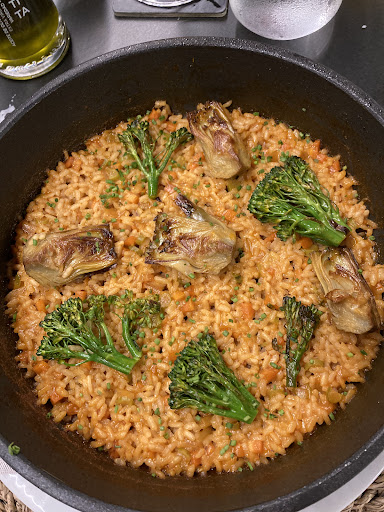 Read moreComimos en la zona que hace las veces de cafetería, pues clientes que tomaban una cerveza o una copa eran servidos en la misma área común, cuyo cierre son unas cristaleras que proporcionan luz natural, pero que a la vez te convierten en un escaparate para quienes pasean por Zalaeta, restando intimidad a la cena, aunque para tomar un aperitivo la objeción no sea la misma. Buen y educado servicio, aunque un tanto raudos en la recogida, coloquialmente, , algo impropio de la supuesta categoría en la que el restaurante se inscribe, incluso espacialmente, pues se ubica en el hotel Double Tree by Hilton. Comenzamos con una refrescante ensaladilla con gambas de cristal. Sencillamente deliciosa. Mahonesa muy acertada, en sabor y proporción. Continuamos con una Burrata con ( supuestas ) alcachofas confitadas, pesto y pan de aldea frito. Bien en cuanto a sabor, pero eso de pluralizar las alcachofas, dónde estaban ?, dudo, incluso, de que nos hubiesen servido una única pieza debidamente troceada, tal era su escasez. Evidentemente pertenecía a una especie élfica, pues, su ausencia, clamaba. Una pena, pues el mix era muy sugerente, pero la Burrata copó el protagonismo. Sabroso el Wok de noodles con verduras de temporada, pesto y pan de aldea frito. Un acierto, por la elección y por su elaboración. En los tres casos el emplatado fue atractivo y a la altura del marco que esperábamos, a pesar de las objeciones. El postre, sobresaliente. Aquí sí, una generosa ración de un chocolate pleno, con una bola de helado que me recordó a un sorbete de limón ( nada nos explicaron ), sobre una base de galleta desmigada. Los golosos disfrutarán, y los que lo somos menos... también lo hicimos. Para acompañar la cena elegí el siempre notable Textures de Pedra Blanc de Negres 2018, de fina y persistente burbuja, y con ese toque peculiar que proporcionan la Xarel-lo Vermell ( al 50% ), la Sumoll y la Bastard Negre, cada una al 25% Un Brut Nature que recomiendo por su singularidad. Una cosa que no me gustó fue que la música de fondo estuviese excesivamente alta ; algo impropio de la teórica categoría del local, y un aspecto a corregir, pues tuvimos que hacérselo notar al camarero que...
