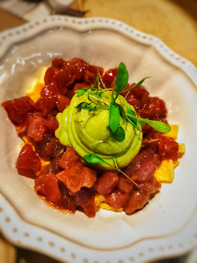 Read moreEn una ubicación inmejorable: a calle de los vinos; donde está todo el "jaleo". Ofrecen una extensa variedad de vinos acompañada de pinchos de autor (que siempre están visibles en la barra) y una carta de cocina creativa de base tradicional que traslada el nivel de detalle con el que está estudiado y elaborado cada plato. Aunque tienen muchos que nos apetecía probar, creemos que hicimos una selección bastante representativa de su cocina. Nos flipó la untuosidad que le aporta el aguacate al tartar de atún, la originalidad de la ensalada con ese toque distinto de la coppa de vaca, el saborazo de las croquetas de gambas y el puré de castañas del rabo, que estaba delicioso! Matices dulces que creemos que suben el plato a un nivel increíble. Y como postre, indudablemente debemos destacar su torrija, tiene fama...y es con razón! Creemos que es un local que no os podéis perder, de los pocos que ofrecen pinchos elaborados y que incluso podéis pedir como "extras" en la cena. Para los amantes del vino es el sitio...