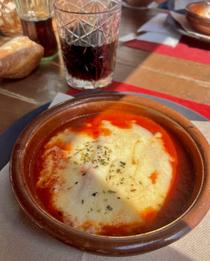 En esta última ocasión probamos el menú del día, que estaba riquísimo. Primero, ambos pedimos la cazuela de queso provolone al horno con jamón y tomate (que ya lo habíamos comido aquí más veces y nos encanta), y después dos platos de pasta: spaghetti alla marinara (un plato de pasta con distintos tipos de marisco, que sin duda recomendaría) y macarrones con queso roquefort.