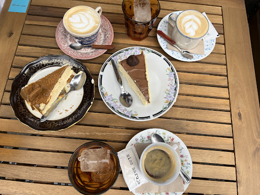 1 extra star for the friendly waiter at the bar, but the waitress (brownish longish hair with blonde streaks) was incredibly rude. You couldn't do a better job if you purposely tried to bully new customers. Was forced in a commanding rude tone to leave my small tugged in umbrella at door, where it got squished and bent by big ones .... She didn't attend to me at all, ignored me looking for a table, and seems to think that someone walks around in the rain with sunglasses for fun and not bec of eye problems. Everyone else that afternoon noticed that I wasn't well, but dizzy and couldn't see well, but she just was unacceptably rude in addition to ignoring me. Not a single welcoming word or anything, whatsoever. She also doesn't understand the word "vegano". Dumped the menu, then my cake without a word on the other end of the table, I didn't even see her bringing the menu. Anyways, coffee and cake without taste and no ambience at all, music just background noise, decor not cool outdated but just cheaply not updated, incl ugly...