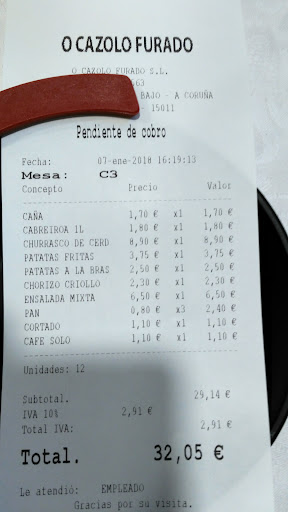 Read moreHemos ido a cenar hoy 8 personas. En la pizarra de afuera estaba indicado 16 euros el churrasco. Al cenar el servicio ha sido bastante lento. Cuándo han traído la carne, el churrasco de cerdo 15minutos antes que el de ternera pese a haberlo pedido mixto, las cantidades eran irrisorias. Pese a ser ocho, salía a prácticamente dos o tres pequeños trozos para cada uno, la mayor parte hueso solo. Al cobrarnos, nos cobran 19'50, pese a que en la entrada ponía 16. Una vez pagado, nos dicen que todavía falta la bebida, que nos la cobran después ascendiendo el montante a 22'25. Ante esto, le preguntamos al camarero por el precio que ponía en la pizarra de la entrada, y nos dice que eso es solo por el día, le preguntamos si eso obviamente no debería estar indicado y el camarero contesta que eso es cosa del jefe. Ha sido una experiencia pésima, donde al ir con banderas de España al ser hoy el partido y ser chavales jóvenes, vieron que no eramos de Coruña, y resumidamente, se han decidido a timarnos. Pese a estar discutiendo el precio con el camarero, el jefe no se ha dignado a aparecer. Es increíble que a día de hoy todavía se sigan cometiendo estas estafas, un sitio al que jamás volver. De los dos camareros que había en el local nada malo que decir, ya que ellos no tienen la culpa del precio y condiciones del dueño del local y han tenido un trato cordial. Una lástima no se pueda reseñar locales de esta índole con...