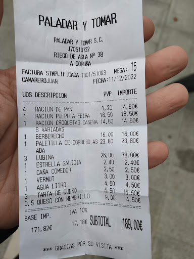 Read moreMi experiencia ha sido muy muy mala (y adjunto el ticket para que no se diga que es una reseña falsa). No la puse antes porque había extraviado el ticket y lo encontré hoy en una chaqueta. Fui a comer con la familia, 4 personas. A pesar de haber reservado, tuvimos bastante tiempo de espera aunque que solo había 3 mesas ocupadas cuando llegamos. La lubina estaba bastante bien, pero la cantidad ridícula. Media lubina de 1kg o 1.5kg para tres personas, lo que se traduce en un pequeño trozo de menos del tamaño de la palma de mi mano para cada persona. A 26€ la ración, hagan sus cuentas. El resto, lo que se puede ver en la foto y al precio indicado en la misma. En general, la comida estaba bien, pero escasa, debe ser la marca de la casa. Pagamos, 4 personas, a casi 50€ por persona, y salimos con hambre. Hasta aquí podría decirse que el único inconveniente, por llamarle de alguna manera, es el precio vs cantidad, ya que la calidad/sabor esta bien (y digo bien, bien sin más, un 6.5 o 7 sobre 10). La cuestión fue al día siguiente, que toda la familia excepto una persona que no había probado los berberechos (posibles "culpable") estuvimos fatal: fiebre, vómitos, cagalera.. y así durante 2-3 días. El médico confirmó la intoxicación alimentaria. Trabajo en una multinacional y he viajado mucho, llevo más de 15 años comiendo asiduamente fuera de casa por trabajo, e intento siempre seleccionar los sitios donde voy a comer. Es la primera vez en todo este tiempo que me dan un producto en este estado..en mi vida me había pasado algo así. Y tampoco es la primera "mariscada" de mi vida.