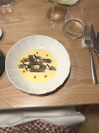 Visited this Michelin recommendation and opted for the smaller menu. Firstly, the ambiance is very luminous, you can have the view of the seaside and the interior is very simple but there’s still care in the choice of cutlery and dishes. Secondly, staff was really nice. I would have appreciated a small explanation of each dish (at a Michelin level, once you have the stars, this is really a must in my opinion) but at least staff wasn’t in a hurry. I am aware this isn’t starred, but it’s always the details that make the difference. The menu boasted a few highlights, including the crudo de jurel and the bocata (mouth watering, just a top dish). The cannellone was also amazing, but came towards the end when we were already stuffed. I would have personally removed the potato rösti block and the croqueta - not that original after the crudo de jurel, and sadly too filling. I also didn’t like the alita de pollo, but that was my personal taste - I am not too much a fan. The tomato carpaccio would have needed a light pinch of salt, and probably I would have served this mid course to break from the different fried food (croqueta, potato, bacalao). In addition, I would have loved to finish with a lighter dessert. When telling this to the waiter, he said that the first dessert (lighter and more citric) is thought to clean the palate and to prepare to the final one (a sort of chocolate cake with ice cream). I am fine with the concept, but then I suggest to revisit the proportions because at the end of the dinner we were too full, so maybe the citric desert should be half of it. Still, I can see originality, I would just suggest to revise some proportions and I recommend it because there’s quality of ingredients, it’s a nice place...