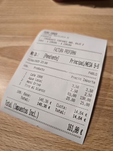 Precio final con 5 consumiciones y 3 cafés, casi 214, sobre 72€ por cabeza. Aceptable relación calidad-precio, aunque tienen que pulir varios de pasos del menú, que desequilibran la experiencia. Por menos de ese precio tienes restaurantes con estrella en la ciudad en donde el disfrute es muchísimo mayor.