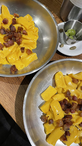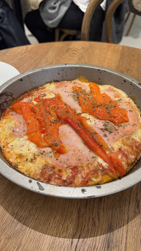 ▪️Entrantes: comenzamos con una pizza de jamón y morrones al estilo argentino. Fue una grata sorpresa descubrir este tipo de pizza, con una masa más esponjosa y gruesa que la napolitana, y mucha mozzarella.🧀 Aunque no podemos compararla con las auténticas pizzas argentinas, ¡nos gustó mucho! 🍕 ▪️Platos principales: aquí vinieron los altibajos. Pedimos rigatoni con carbonara de pistacho y pappardelle con tuco casero de ragú de ternera. La pasta, como tal, estaba bien cocida, pero las salsas dejaron que desear. La carbonara no tenía rastro del sabor a pistacho, y el guanciale estaba quemado y de baja calidad. El ragú estuvo algo mejor, aunque tampoco destacó. A su favor, puedes elegir la combinación de pasta y salsa que prefieras. Sin embargo, el precio de las opciones más caras se acerca a restaurantes italianos de mayor calidad en Coruña😕 ▪️Postres: rematamos con una berlinesa rellena de crema. Cumplidora, pero no memorable 🍩