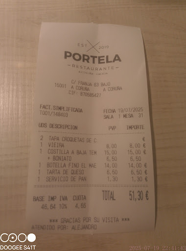 Read moreMi visita a "Portela" fue, en una palabra, decepcionante. Llevado por las buenas reseñas y la ubicación, decidimos probar, pero la experiencia no estuvo a la altura de las expectativas. El problema principal radica en la relación calidad-precio, que me pareció totalmente desproporcionada. Como se puede ver en la foto del pulpo, las raciones son extremadamente pequeñas. Pedimos una ración de pulpo "a feira" a 20 €, y lo que nos sirvieron fue una cantidad irrisoria, apenas unos trozos. Lo mismo ocurrió con la carne y otros platos, que se anunciaban como "raciones", pero en realidad eran más bien platillos de degustación a precios de ración completa. El ticket de 107 € para lo que comimos nos pareció un verdadero robo. Para ser honesto, la comida en sí no estaba mala, pero la cantidad era tan escasa que no compensaba el alto precio. Salimos del restaurante con la sensación de que nos habían tomado el pelo. Aunque el servicio fue correcto, la experiencia general se vio empañada por la sensación de haber pagado demasiado por tan poco. En A Coruña hay una oferta gastronómica fantástica, y sinceramente, creo que hay opciones mucho mejores donde se puede comer bien y a un precio justo. Si buscas una comida satisfactoria y a un precio razonable, te recomiendo buscar otro lugar. "Portela" no merece la pena, y es una pena, porque la impresión que me queda es de un local que se aprovecha de su ubicación para cobrar precios de excesivamente altos por...