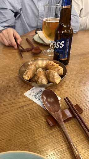 Read moreAyer a la noche hemos ido a probar por primera vez comida coreana. Aunque los ingredientes no son nada del otro mundo, ha estado todo muy pero que muy rico. Recomendamos totalmente. Os comento un poco: Hemos ido sin reserva, nos han atendido en la puerta y nos han acompañado a una mesa que tenían libre. El local estaba lleno de gente, no es un local grande pero tienen bastantes mesas y la decoración me ha encantado, sencilla pero refuerza el ambiente para estar en tranquilidad y calidez. La tonalidad de las luces es perfecta, ni demasiado claro ni demasiado oscuro, no como las modas de ahora de hacer los locales oscuros, que te da el sueño en ellos. Un apunte*:Me ha encantado que las paredes sean blancas pero el techo negro. Según nos sentamos, pedimos una botella de vino de frutos rojos, que por cierto está muy bueno, dulzón con un toque agrio al final. También pedimos dos entrantes, a los que nos olvidamos de sacar foto. Según acabamos nos recogieron la mesa y antes de servirnos los siguientes platos, el camarero Diego, nos limpió la mesa de las migas de comida que nos habían caído, este detalle me parece un puntazo. Después de nuestros platos, decidimos pedir otro, ya que nosotros somos de comer mucho, al llegar este último a la mesa, el camarero, Diego, nos explicó como se debería comer ese plato, le dijimos que adelante, que nos lo preparase él, y sin dudar un segundo, nos preparó el plato como había dicho. NOS ENCANTÓ. Hemos pedido también la cerveza Cass para probar, muy suave, personalmente me gustó mucho. Luego les pedimos un postre de cada para probarlos, lo mismo, todo genial, a cada uno le gustó más uno que otro, pero todos genial. Me ha gustado mucho ver, también, que tienen varias opciones vegetarianas.