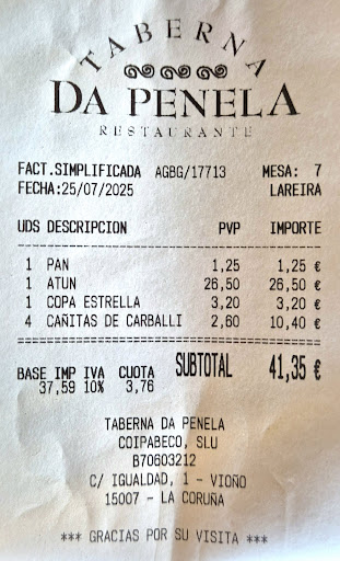 Hay que tener mucho valor a dejar la licencia de hostelería para que preparen auténtica basura que luego comparan como comida tradicional o de la abuela, un frito aceitoso con sabor a rancio de jamón malo,y claro teniendo gente no profesional no saben que significa cocinar la harina porque pagar por unas almeja 20,50 y otros 11 y pico para comer un plato que sabe a harina y lo llaman marinera .. y la tortilla madre mía está líquida si de tanto aceite que le meten entre pochar las patatas y hacerla y hablamos de aceite de baja calidad! Como a los empleados que le piden CV tendría que haber para los empresarios porque de comida mala ya...