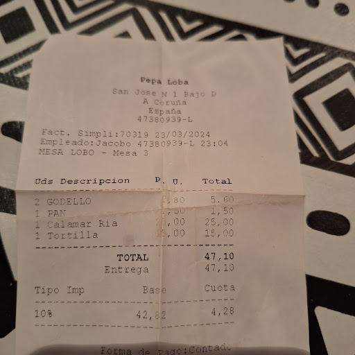 Read moreUN TIMO Para empezar no tienen carta, te dicen lo que hay de boca. Después vino la cocinera y decidimos pedir una ración de calamares, le preguntamos si hace tortilla y nos dice venga os hago una pequeña. Llegaron los calamares con patatas fritas, eran mas patatas que calamares y ni sabíamos que venían con patatas. Después llegó la tortilla al verla quedamos, fina como un papel y nada buena. No tomamos postre y café solo tenían de pota. Nos levantamos para ir a pagar a la barra y ya tenían la cuenta sacada. Cual fue nuestra sorpresa 47,10 en ese momento quedamos que no fuimos capaces de decir nada pero después al irnos y pensar. Nos habrían cobrado por una ración de calamares 25 euros y por una mini...