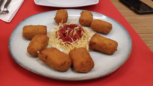 Ante todo, es la segunda vez que venimos, destacar el servicio, atento y profesional, con cintura para hacer una sugerencia cuando pides un plato de la carta...sobre el cual no te han comentado a priori que hoy no está disponible ; sumado el hecho de que uno va a disfrutar y hay alternativas, sobre el papel, atractivas, "incidencia" resuelta. Buenos productos, emplatado esmerado - importante -, y buen punto en la preparación en todo lo pedido podría ser el resumen de una grata experiencia gastronómica, con enfoque hacia la cocina tradicional, pero con un plus que te aleja de un redundante déjà vu. Comenzamos con el polícromo variado de croquetas, ya atractivo a la vista, y que responde perfectamente en sabor a la pléyade de los diferentes sabores y mix creados en la cocina. Así pues, y acompañadas de unas patatas paja crujientes, tomamos - 2 unidades de cada sabor ofrecido - croquetas de centollo, de pulpo, de boletus, de setas y grelos, de bacalao, de espinacas con queso y de chipirones con jamón. Un plato bizantino a la vista y por las sensaciones derivadas del abanico de elaboraciones reseñadas, en las que tan distintos sabores casan perfectamente y sin artificios con la descripción verbal - que no se queda en un simple recitado sin contenido práctico a la hora de plasmarlo -. Acertado tambièn el generoso bacalao al ajillo, con gambas, almejas, langostinos, pimientos del piquillo y patatas cocidas. Acertado acompañamiento para un bacalao bien desalado y cuyo sabor, ya singular , se ve potenciado por el ajillo. El secreto de ibérico también fue muy gratificante, con sus patatas fritas de guarnización, cuya cantidad pedí reducir y sustituirla por una combinación de pimientos del piquillo y de pimientos rojos y verdes salteados con poco aceite. Jugoso y de grato paladar. El tiramisú, que en otros sitios defrauda o deja dudas en cuanto al resultado, aquí fue consumido, voluntariamente, hasta el último bocado. Bien presentado, con fresa natural laminada y una nuez de nata. Bebimos una refrescante sangría, excesivamente dulce en el primer sorbo, pero una vez comentado, sabiamente rectificada con el giro suficiente para merecer nuestra aprobación. Luminosa la zona de la terraza cubierta en la que comimos, suficientemente climatizada. Cómoda, pero sin llegar a ser acogedora, el único punto que le falta, como en la...