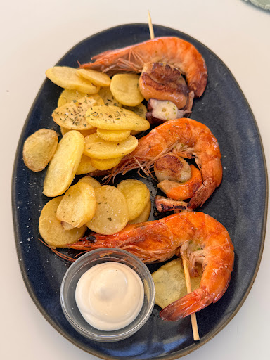 Food was delicious, dishes are simple with reasonable portions and great taste. They have a floored terrace and a some tables on the sand. Great views of the beach and cool breeze. We were here for late lunch and drinks, full family with dog. Service was top notch, place is kid and...