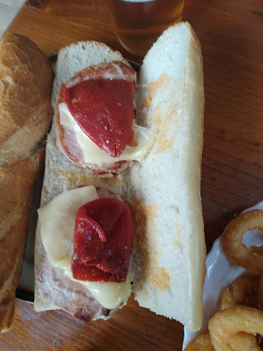 La atención: Dejo bastante que desear, hay que pedir en barra aunque vayas a comer en las mesas de fuera, la camarera que parecía nerviosa nos detallo lo que nos podía ofrecer por partes (menos mal que solo son 4 cosas) y nada mas apuntar nuestras peticiones en el papel nos exigió pagar primero de mala manera antes de ni siquiera servir bebidas o mandar la comanda a cocina, me quede a cuadros.... No nos preparón mesa ni tampoco nos ofrecieron cubiertos hasta que se los solicitamos después de traernos a la mesa los calamares y croquetas. La comida: croquetas frías pero bien de sabor (aunque para mi caras), lo mejor de la comida los calamares, y los bocadillos dejan mucho que desear con un pan grande chicloso con poco ingrediente dentro