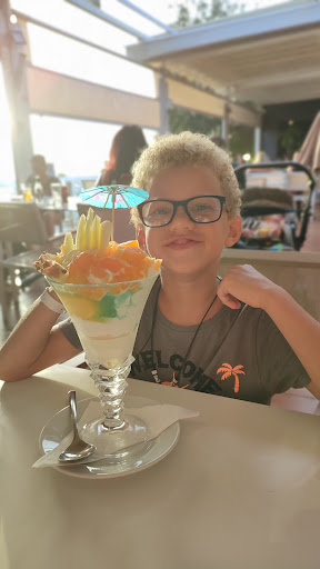 El camarero era agradable, las costillas estaban buenas, las gambas al ajillo estaban buenas y el mini steak con papas para niños también estaban bien.