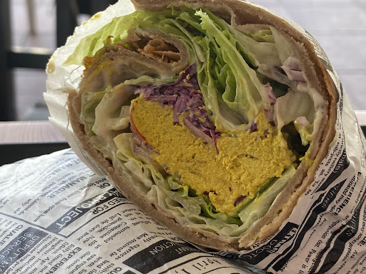 WRAP FILLED WITH VEGAN PUMPKIN SEED EGG, LETTUCE, RED CABBAGE, ONIONS, TOMATOES, CASHEW GARLIC SAUCE