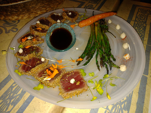 Oh yes, to the food... It's delicious! Firstly, the patatas fritas are not just "standard fried potatoes" you might get in the tourist trap restaurants and cafes. These are lovingly prepared thin wedges of deep fried Canarian potatoes which have been cut into with a deep V shape to create two crispy wings of potato and a thin fluffy centre, served with creamy home made alioli garlic dip. A very decent portion size too. Note: The alioli crops up as a garnish element with most other dishes (rightly so) and is also served alongside the oven toasted bread - my son said it was much better than standard garlic butter. All so moreish! The meatballs came in a rich tomato sauce, also great for dipping bread and the patatas fritas. Pulpo tapas was a thick tentacle on a bed of creamy smooth mash. Croquetas were crispy and the filling was mainly meat rather than potato - we thought the chicken was the tastiest, so full of meat. The tuna tataki main was beautiful (and the tastiest dish for us) - thin slices of tuna with a thin sesame seed crusting, all delicately seasoned and provided with soy sauce to dip, plus pan roasted asparagus and carrot.