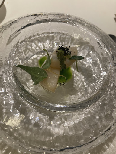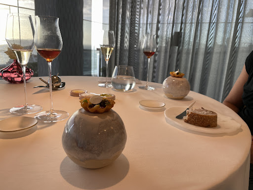 They had the shades closed, even though it was currently cloudy and wouldn't open them when we asked. Much later when they did finally open the shades, the sun was now low below the clouds and shined directly in my husband's eyes (other diners were not affected, he just had the unlucky chair). The bread service was awkward. They brought initial bread (we got to each pick a piece from a few options) and multiple types of butter. It seemed like this would be an ongoing thing through the meal and they never cleared the butter or bread plates, but they never offered more bread to us. We would have loved more because the butter was so good. We got the wine pairing- at the other restaurants there was one sommelier that brought each wine and kept things timed, but here the wine came from different random people. They were not very good about keeping our water filled. At one point my husband got up to go to the bathroom and they refolded his napkin (as usually happens at this level of restaurant) but the napkin was super dirty and they didn't change it.