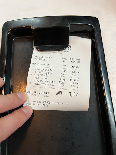 Read moreThe waiters are so unorganised. They came to our table multiple times with different drink and food and we told them it wasn’t for us. The worst thing is I ordered a tomato salad and was served a tuna salad which I normally don’t eat. I then asked the waiter if it was a tomato salad when served and he said yes so I ate it even tho I don’t like tuna. When the bill arrived it said it was a tuna salad which we said wasn’t the thing we ordered. Then the waiter started to speak in Spanish saying I ate it so I have to pay that price even tho I asked the waiter before eating it. He started screaming and swearing in Spanish so the whole restaurant was looking. Wouldn’t recommend at all!!! Worst...