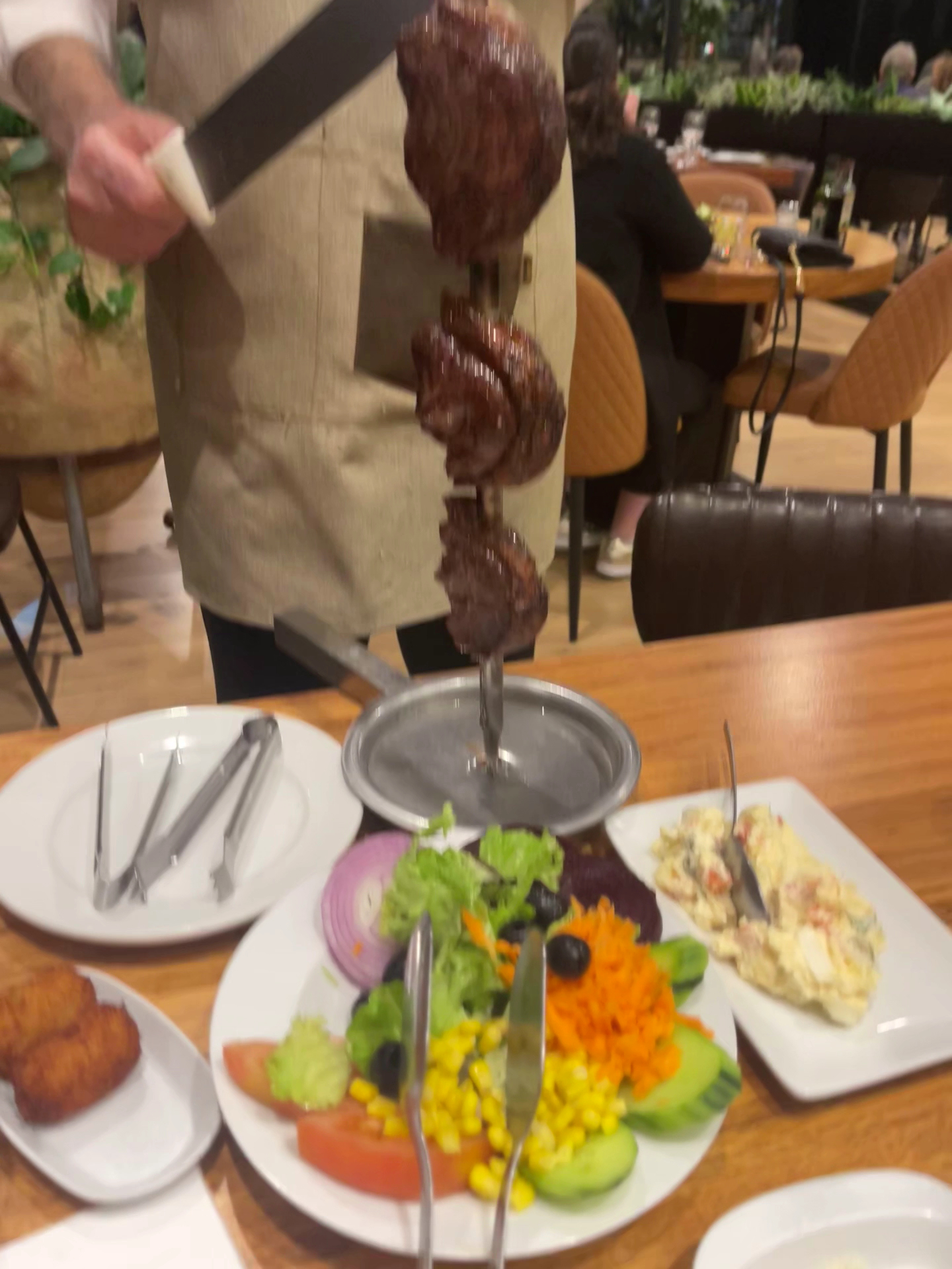 Read moreAwesome dining experience for affordable prices. We were staying at the Trovisca beach area and although it was definitely a walking distance, we took a cab (less than 4€) since it was uphill and walked back from there. Entrance is a bit unusual since it was as if you were entering the adjacent gas station. However, the place is really like a fancy restaurant. Food was pretty good. No buffet for the sides but in fact I liked their system of bringing the sides to the table more. I can count for you 10 sides: corn on the cub, asparagus, grilled veggies, rice, fries, fried yuka, sautéed mushroom, rice, garden salad, potato crockets. Maybe I missed one too. All nicely prepared and tasty. They kept bringing them with no pressure at all. Service staff were very nice by the way. The meat (and chicken) kept coming and coming till I surrendered and I don't easily do. As in any rodizio, some cuts were great in quality and seasoning and some were good enough. It also depends on each person but the bottom line is that at 22€/person this was one of the best overall value dining experiences we had in Costa adeje tenerife. Hope they will stay like that till I return to visit them again...