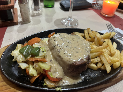 Read moreSo sorry no pics, we scoffed the lot without thinking. Ordered grilled sirloin steak with potatoes (came with canary sauce) & mixed veg - €14.50, sirloin steak with peppercorn sauce with chips & mixed veg - €16.50 & kids' chicken nuggets (6) n chips - €5.95. All arrived about 15 mins after ordering. Steaks came sizzling on skillets. Asked for medium done which they were but obviously still cooking on skillet, so if you like pink maybe order rare/medium. Veg, potato sauce & peppercorn sauce were delicious. Steak was tender & tasty, couldn't fault any of the food at all. Would definitely recommend a visit. We didn't bother with Steak 21 along street as couldn't justify €30+...