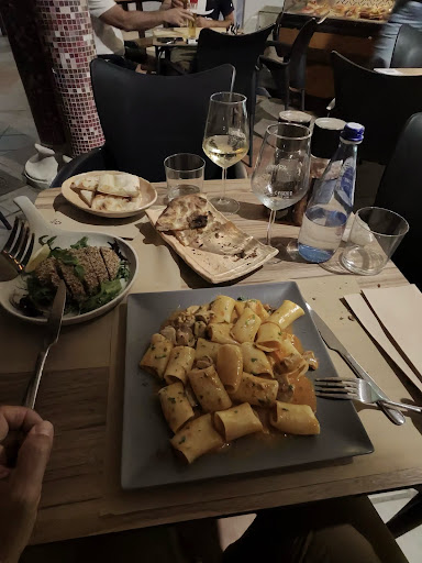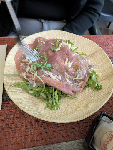 Comimos un carpaccio con rucola, no era el mejor de mi vida pero se sentía que tienen cura de los ingredientes. El Entrecot cocinado a la perfección y con muchas, casi demasiadas, papas al horno. Un plato de Tonnerelli a la Amatriciana, muy buenos de sabor, y también ahí pude apreciar la calidad de los ingredientes, aunque si abría apreciado un puño más de pasta 🤣 La revelación fue la Pinza! Casi quería la segunda! Pude apreciar también los postres y el café de pura calidad Italiana.