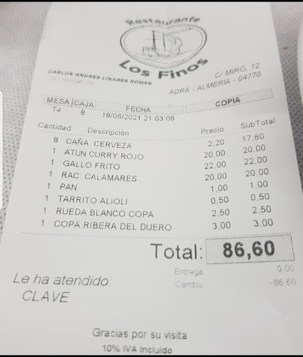 Julio 2019.......Bueno pues añado reseña de julio de 2019. Soy de fuera y suelo ir por Adra varias veces al año, ahora llevaba casi un año sin ir por los Finos al que siempre voy y suelo hacer un gasto de 80/150€ cada vez. Pues me ha sorprendido el bajon de calidad, cantidad y al mismo tiempo subida de precio q ha experimentado este bar desde mi ultima vez. Con gran pena tengo q decir que no voy a volver...acepto una subida de precio que no sea un disparate pero la cantidad en las tapas y sobre todo la calidad no acepto q se baje. Como es un bar al que.le tengo aprecio por el monton de años en los que he comido de lujo, me atrevo darles un consejo, si no volveis a dar calidad y cantidad a precios contenidos podeis estar seguros q habeis firmado vuestra sentencia de muerte como bar de tapas de referencia. Puede que aun os quede algun recorrido por.la fama acumulada de los años anteriores pero esta claro q la gente no es tonta y terminará por dejar de ir como voy a hacer yo. Lo mas curioso es q el dia antes de ir un amigo.me.preguntó por bares de tapas de Adra y le recomendé sin dudas Los Finos, me dijo que hacia.poco habia estado y no le habia parecido para tanto, yo pensé que mi amigo no tenia ni idea o habia tenido mala suerte el dia q estuvo, pues nada mas lejos de la realidad, he.podido comprobar personalmente que no es ni rastro de lo que ha sido estos años atras. Supongo que estos años atras habreis ganado mucho dinero y ya os la suda si el bar se viene abajo y teneis q cerrarlo en un poco de tiempo o echar a los camareros pq no hay suficiente negocio. Una autentica pena. Las tapas de atún no son ni parecidas a las q ponian antes, la jibia la.pesan y te.ponen 3 gramos, el pulpo con alioli es alioli con algun pellejo (y pequeño) de pulpo. Las.croquetas de rape no llevan rape ni algo q se le.parezca. las hamburguesas son un pegotito de carne de picada de cuarta regional...bueno hemos.comido.mas tapas que estas q nombro y no se salva ni una... Que os...