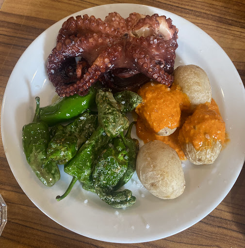 El Surtidor Tapas is a vibrant gem in the neighborhood, embraced by friendly locals. The fried octopus is unparalleled—delicious and melt-in-your-mouth tender, making it one of the best we've ever tasted. The chickpea stew with chorizo is a flavor-packed delight, complemented by the delightful tomato sauce, perfect for bread-dipping.